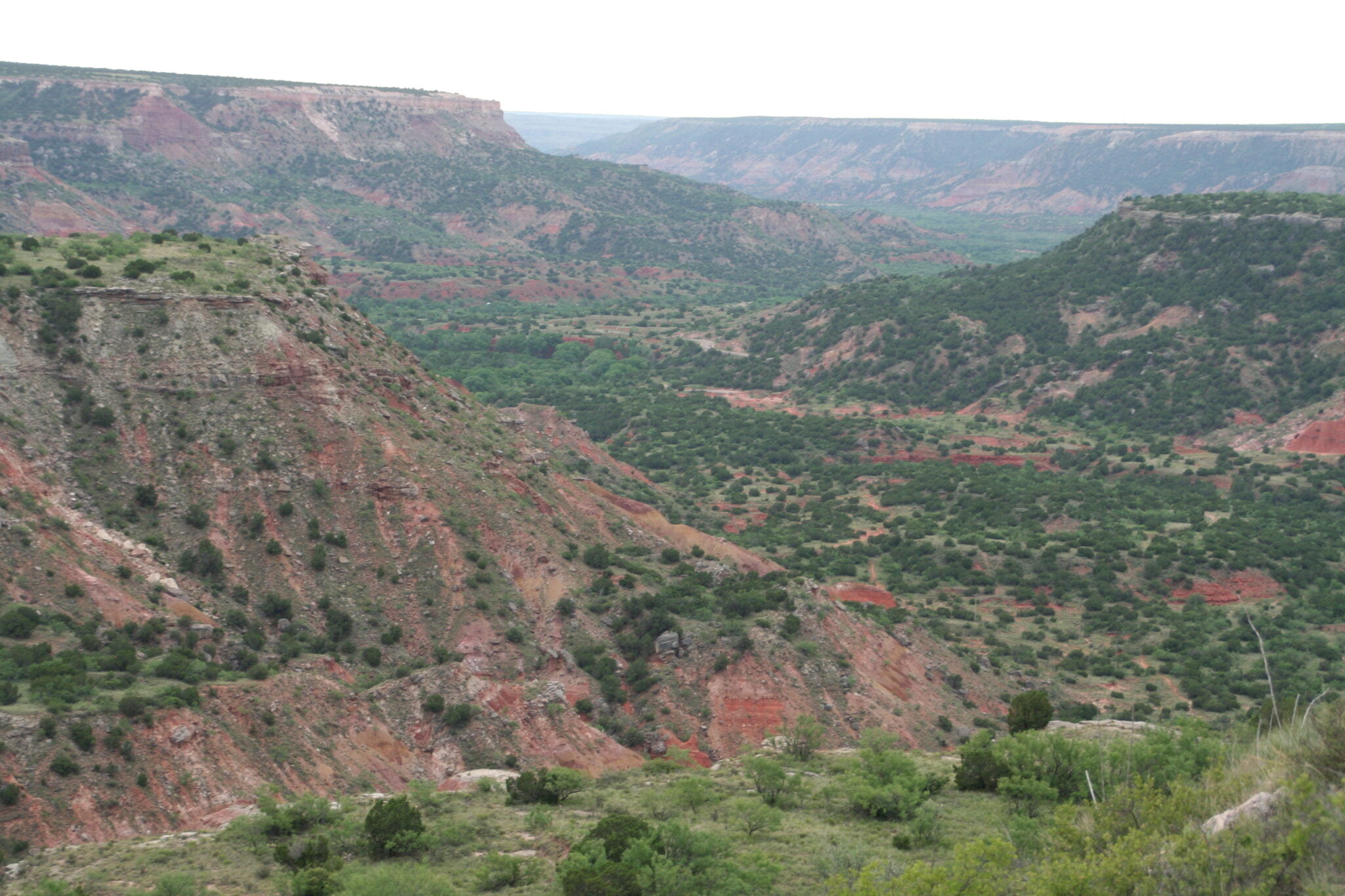 The Caprock, the surface across the Texas Panhandle, is a flat, treeless expanse resistive to erosion. Also known as the Llano Estacado or short grass country. Rivers and running water during the rainy season cross these Great Plains and spill over the edge to the lower elevations, erosion can create chasms. As is the case of the Prairie Dog Fork of the Red River, which created the geological formation of Palo Duro Canyon, located south of Amarillo. Over millions of years the river has eroded down, dropping the floor by 800 feet.