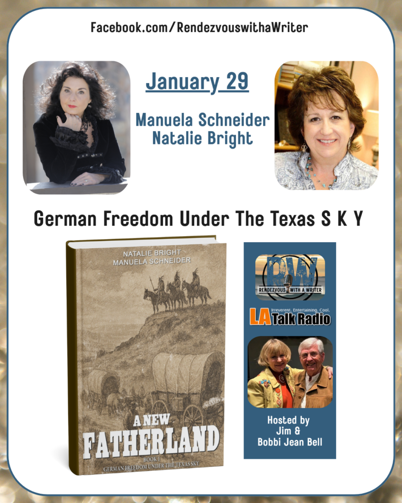 Thursday, January 29, 8pm CST, LIVE Podcast Interview with coauthor Manuela Schneider, LA Talk Radio, “Rendezvous with a Writer”, hosted by Jim and Bobbi Jean Bell.